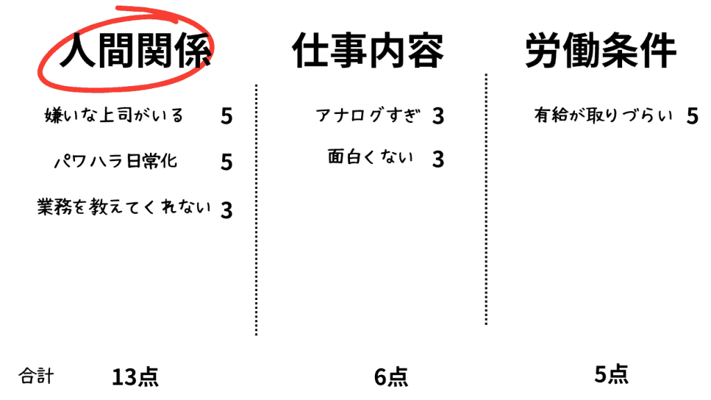- 項目ごとに辞めたいと思った理由を思いつく限り書きまくる
